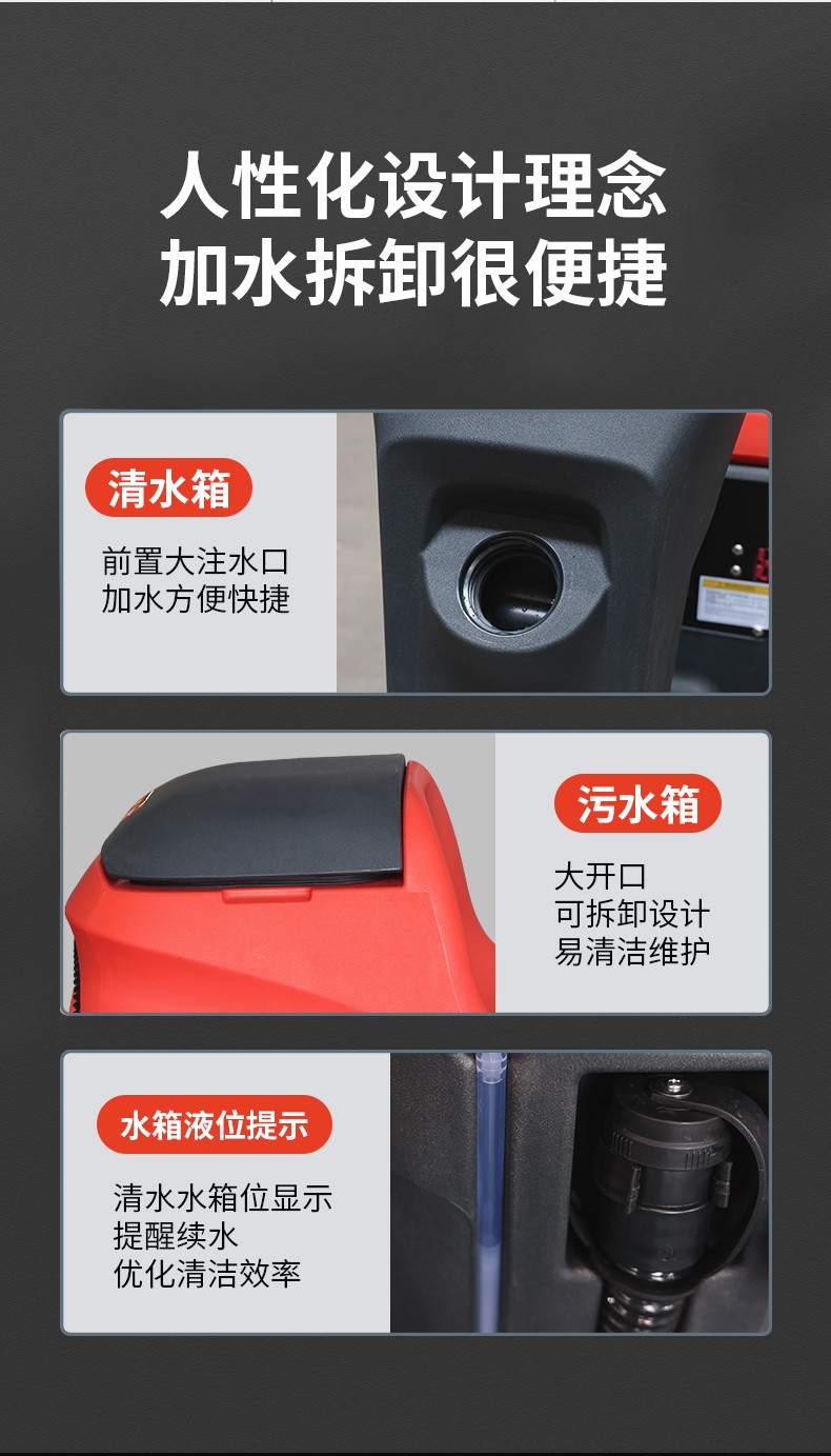 ● 刷盤、水刮架一鍵電動升降,倒車水刮架自動抬升